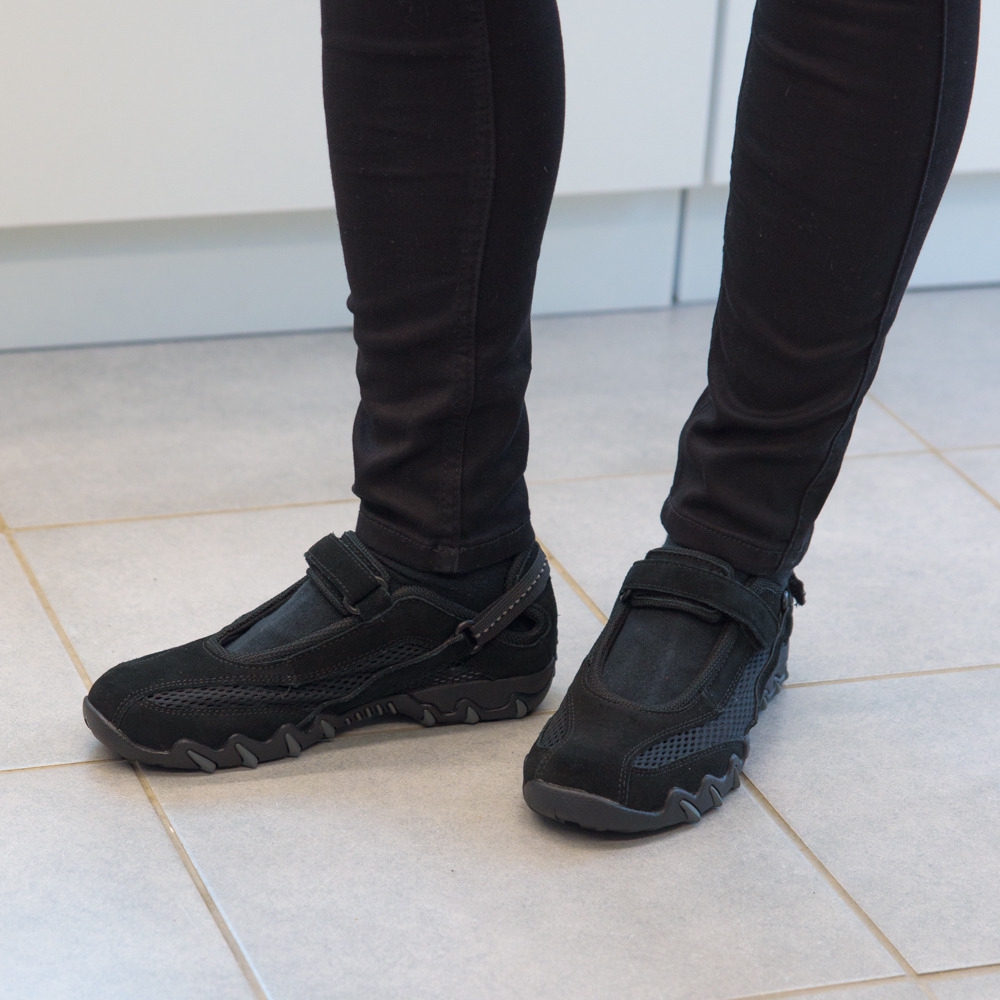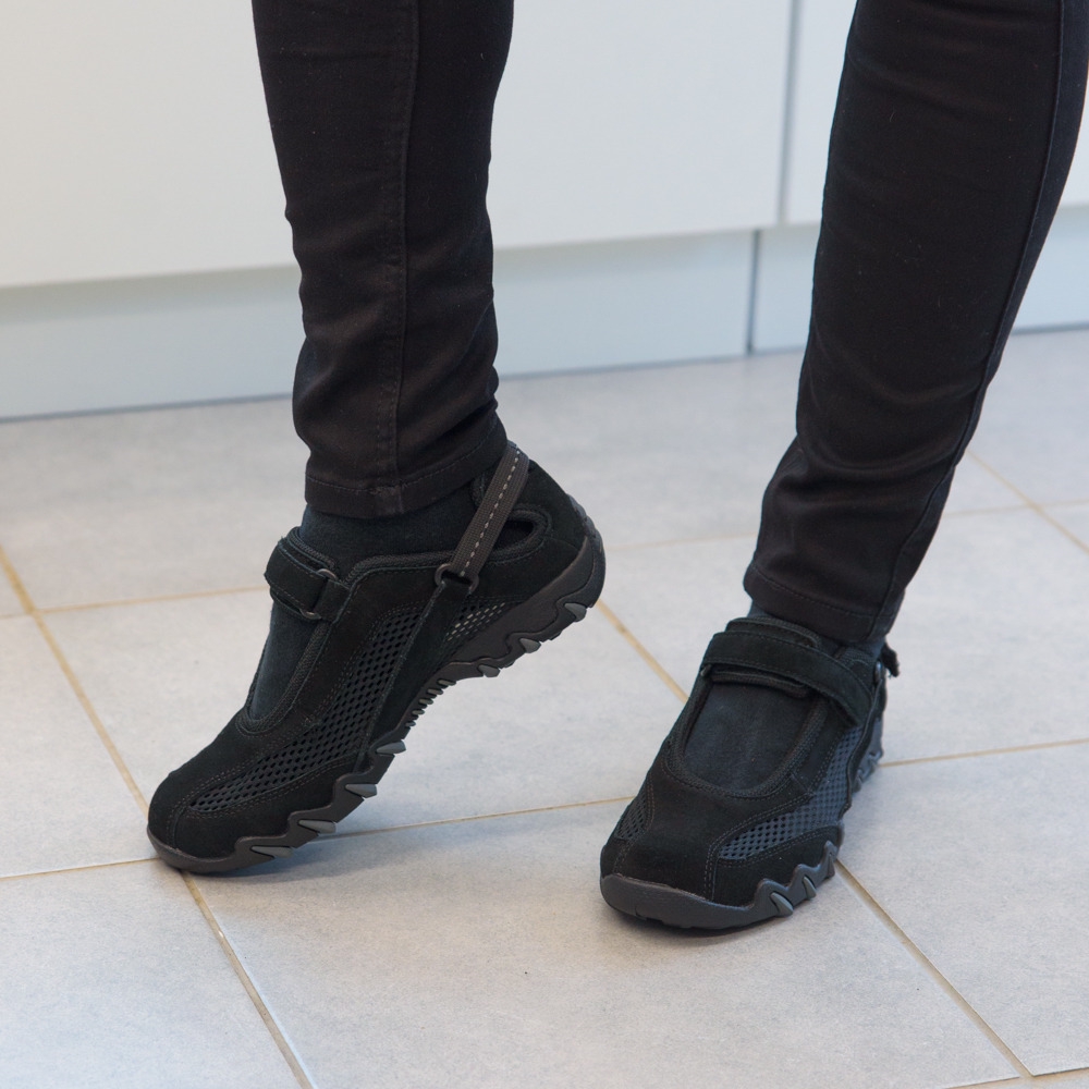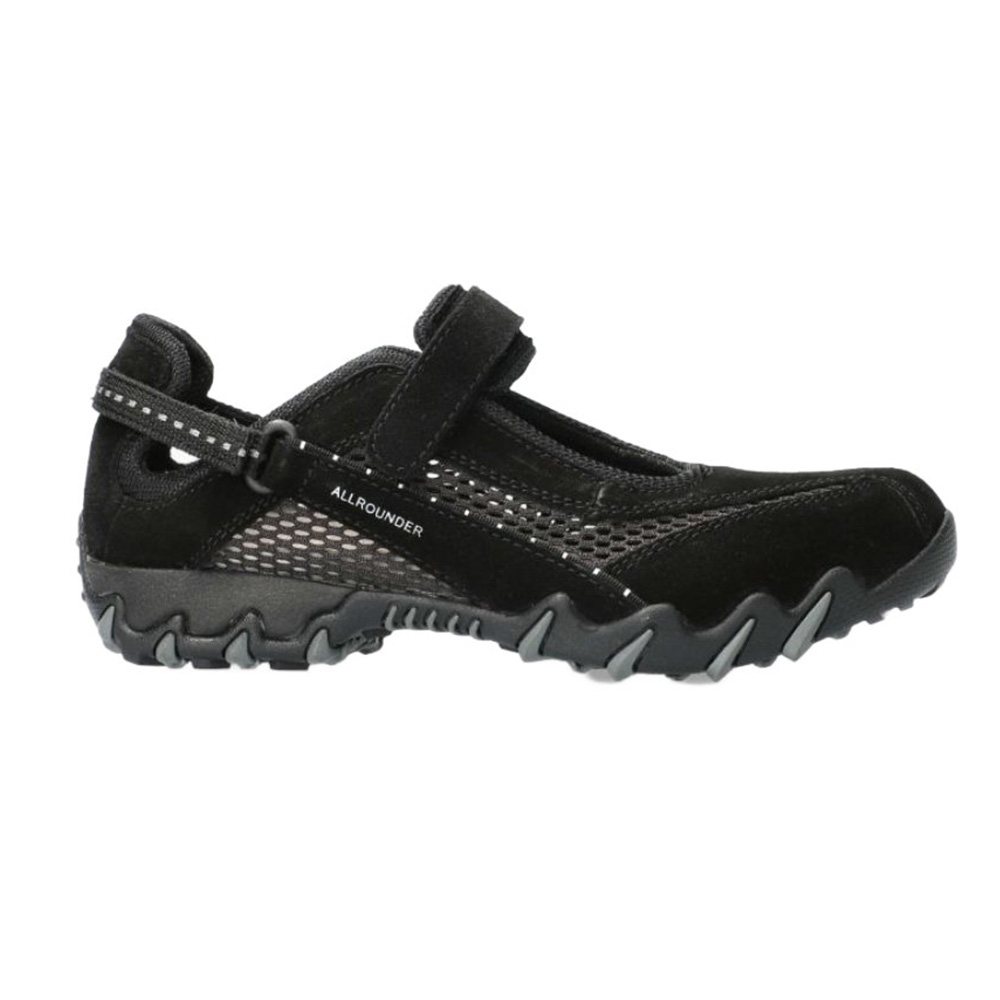 Nämä Allrounder Niro -kävelykengät ovat yhdet myymälän myydyimpiä suosikkeja! Kengässä on tilava lesti, jossa varpaat pääsevät lepäämään. Materiaaleina ovat mokkanahka ja molemmilla sivuilla verkkokangas, mikä tuo jaloille miellyttävää hengittävyyttä. Sisäosa on pehmeää tekstiiliä. Ulkopohja on 100 %:sta kumia ja rouhea pohjaprofiili tuo hyvää pitoa myös epätasaisilla tai kosteilla alustoilla. Kantapäässä on hyvä iskunvaimennus. Sisäpohjallinen on irrotettavissa ja korvattavissa omalla henkilökohtaisella pohjallisella. Kengässä on tarrakiinnitys nilkan edessä ja kantapään takana, mikä takaa täydellisen istuvuuden. Nämä kengät soveltuvat loistavasti niin työhön kuin vapaa-aikaan!