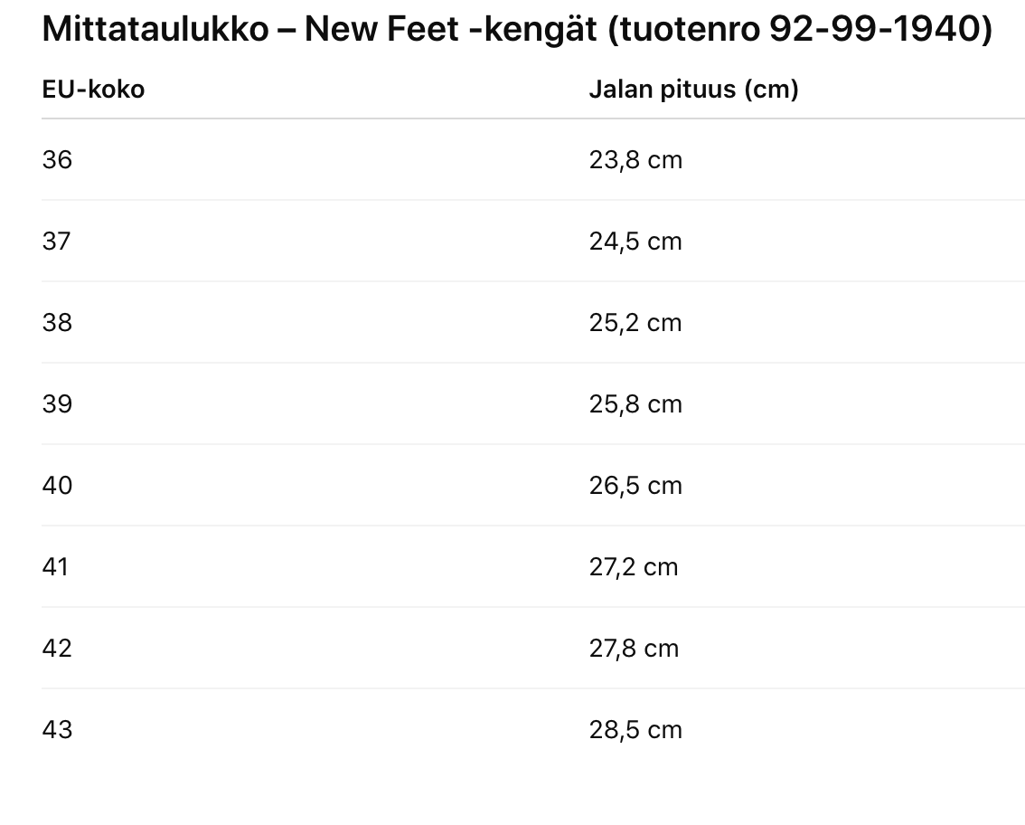 Kengän rakenne on laadukas, ilman sisäsaumoja ja valmistettu jalan anatomia huomioiden; New Feet‑mallisto on alun perin suunniteltu yhdessä jalkaterapeuttien ja suutarien yhteistyössä. Tämä näkyy jokaisessa New Feet kenkien yksityiskohdissa – eikä tämä malli ole poikkeus! Tämä malli on erinomainen valinta esimerkiksi reuma- tai diabeetikoille.